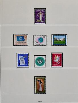 Vereinte Nationen, Genf, postfrische, von 1969-1994 komplette Slg., zusätzlich mit einigen Kleinbögen, im neuwertigen Lindner-T-Vordruckalbum mit Schuber. Die enthaltene gültige Nominale beträgt bereits 360,- SFr. (= 370,- Euro) plus Album, Los 9745 der 217. Auktion, alter Ausruf 150,-