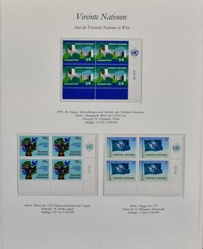 Vereinte Nationen, postfr. Slg. mit Genf 1969/1990 (Nominale 230,- SFr. = 230,- Euro), sowie Wien postfr. 1979/1990, teils in Viererblöcken, Los 9753 der 217. Auktion, alter Ausruf 100,-